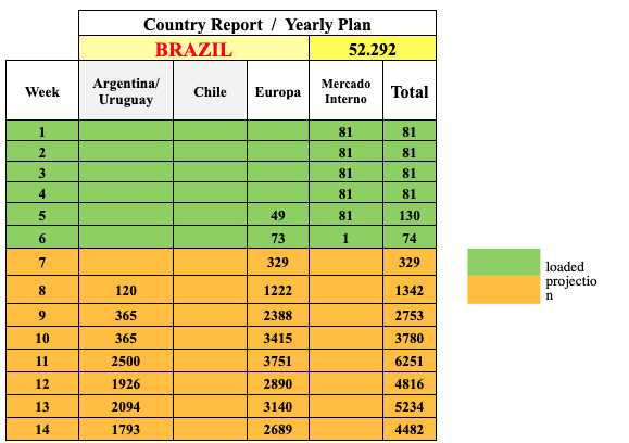 La campaña de Brasil está retrasada en 3 semanas, los primeros envíos de Carmen (Mendez) ya acontecieron en fines de enero. Para febrero espera aun poco volumen, pero un incremento rápido para marzo es esperado.